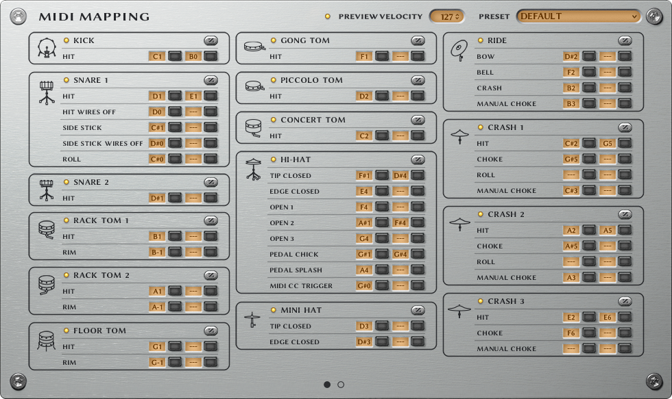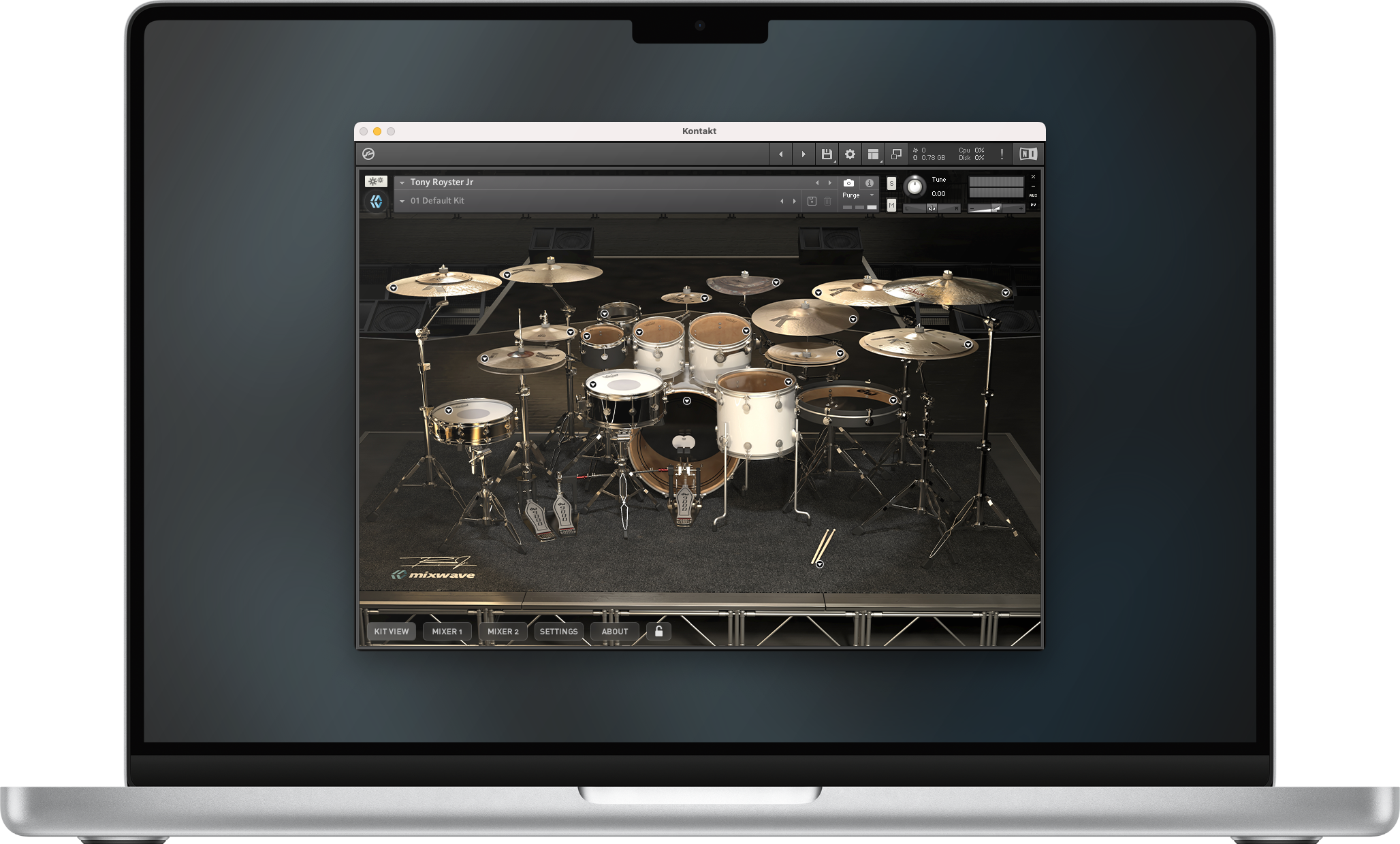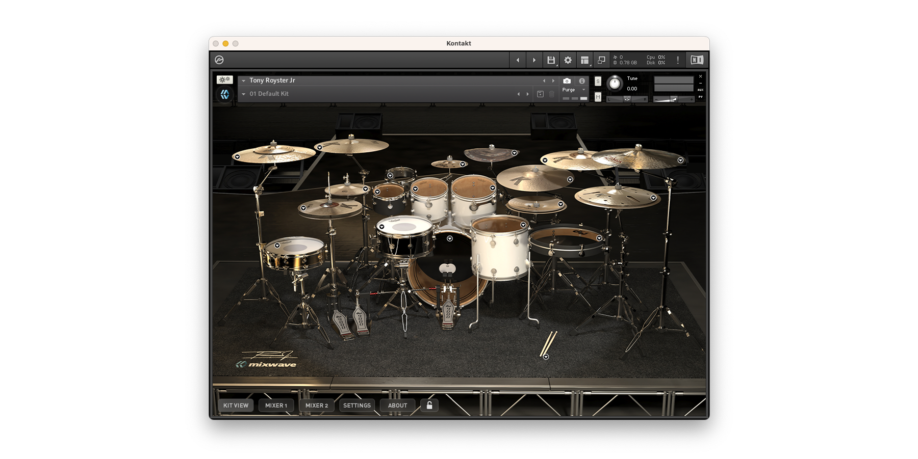 Featuring 13 drums with 6 snare drum options and an array of 11 cymbals, sampled and mixed at MixWave Studios.